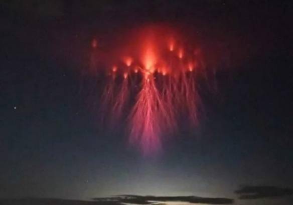 雷暴中像是巨大水母的红色闪电
