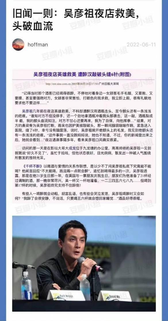 吴彦祖英雄救美头破血流旧闻被翻:勇救被骚扰的女性 近日,吴彦祖2005年英雄救美的新闻被翻出。据悉,当时吴彦祖曾看到醉汉酒后骚扰女顾客,收到女孩眼神求助后他上前劝阻。不料遭醉汉恼羞成怒用酒瓶砸过来,打了一次还不够,醉汉疯狂拿酒瓶袭击他的头部。 当时为了自保他进行反击,将那位醉汉的鼻梁骨打断。送入医院后吴彦祖缝了6针,直至今日额头还有浅浅的疤痕。